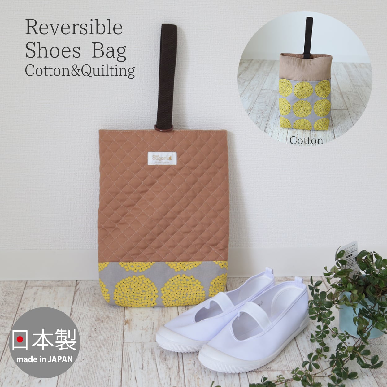 コットン生地とキルティング生地の二重仕立てのリバーシブルのこだわりシューズバッグ!